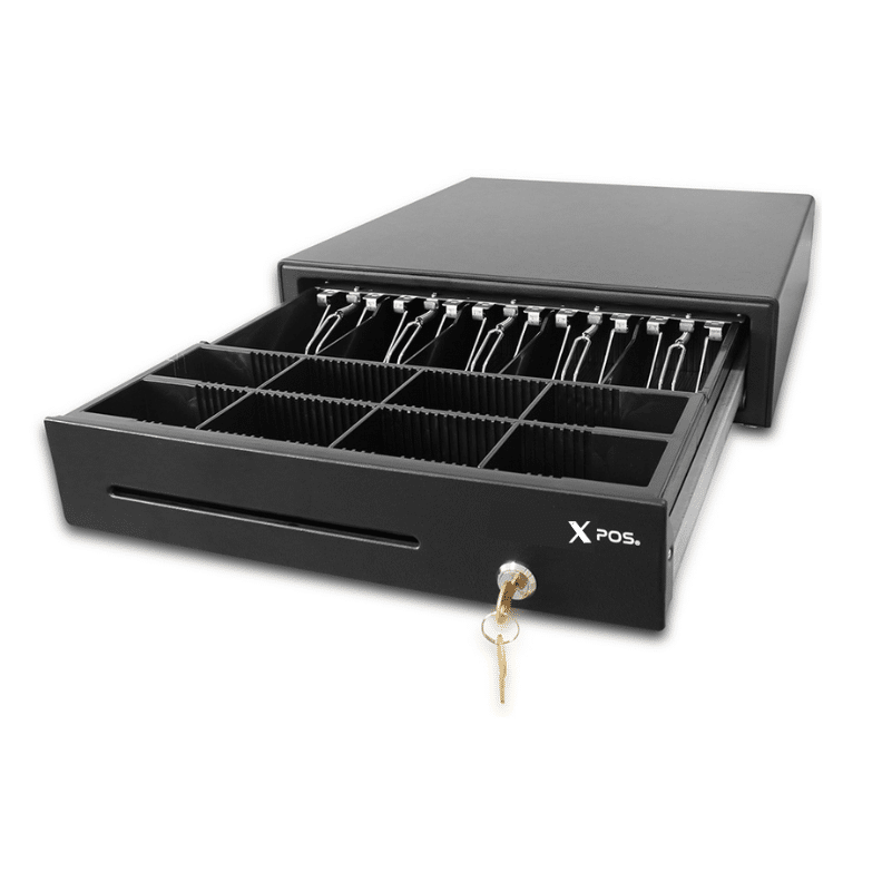 Cajón fabricado con estructura de metal apto para gran almacenamiento de dinero. Riel y rodamientos fabricado en plástico de alta resistencia; probado a más de un millón de ciclos de apertura. Con opciones de apertura automática desde la impresora de recibos o el computador y apertura manual por medio de llave; con 5 compartimentos para billetes con pisa billetes metálicos y 8 compartimientos para monedas ideal para mercados minoristas; supermercados; corporativos y puntos de pago donde exista manejo constante de dinero en efectivo.